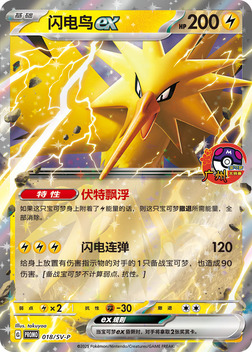 Purchase designated card sets at the Guangzhou Masters main venue and receive one Guangzhou Masters commemorative bonus card, “Zapdos EX” (4,200 cards available at the shopping station, while supplies last).