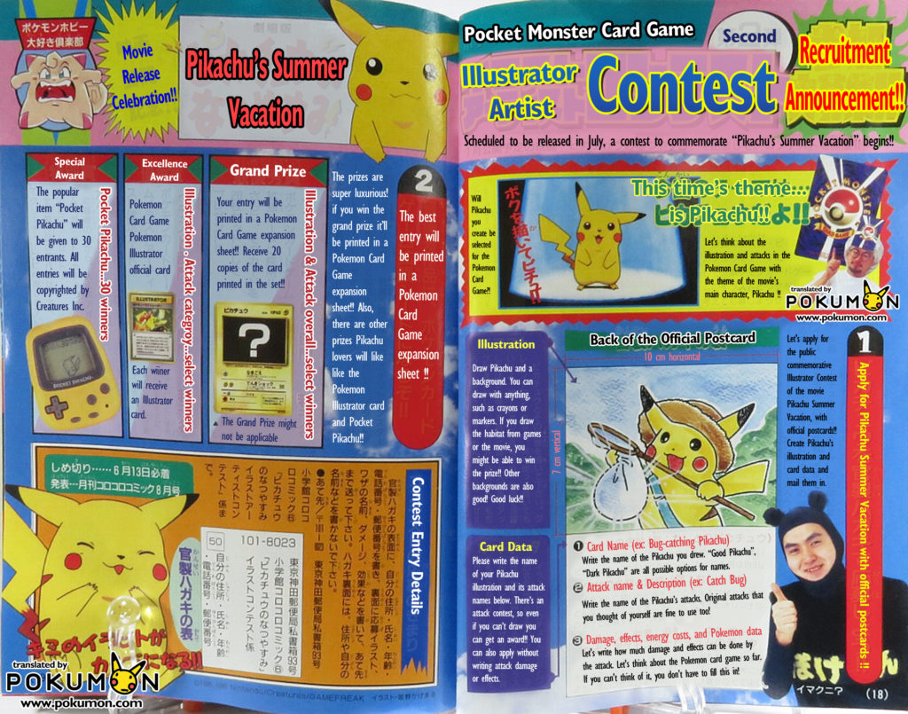 The last of the early-era illustration contests was announced in the June 1998 issue of CoroCoro Comic, published on May 15, 1998. The contest commemorated the release of the short film attached to the first Pokemon movie, Pikachu’s Summer Vacation, releasing later in the summer in July 1998.