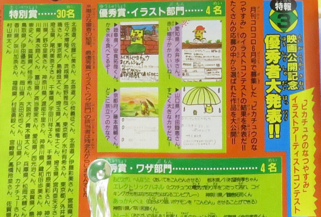 Winners would be announced 2 months later in the August 1998 issue of CoroCoro Comic, published on July 15, 1998. The winner announcement page correctly tagged the contest as the 3rd illustration contest.