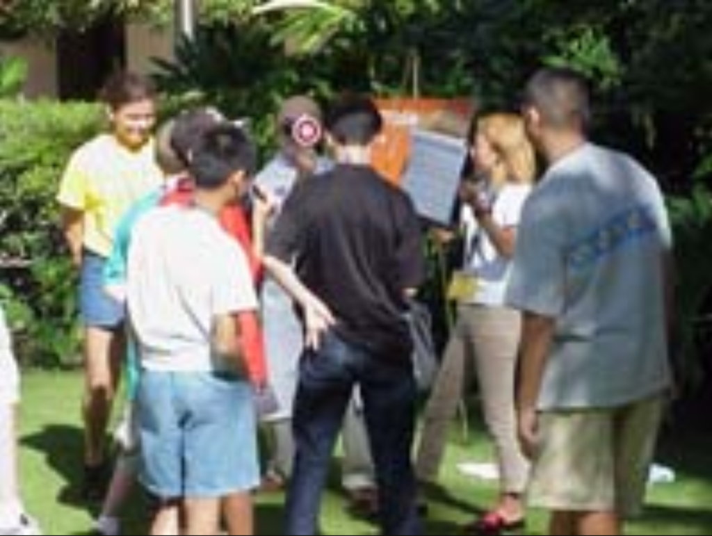 After that we went around to the different gyms and would battle people in there, in Giovanni’s gym you battled Team Rocket, which was easy, they weren’t very good players and all had bad fighting decks with Sandshrews. Lt. Surge’s gym was harder because these were all very good players from Wizards playing 4 Oak 4 Electabuzz 3 Wigglytuff decks. They weren’t allowed to use any Pokémon that weren’t colorless or lightning type. After all, it was an Electric Gym! My Hitmonchans easily beat Mike Elliot, actually Lt. Surge at the time, wearing a green military suit. Heh. I had him sign by Lt. Surge’s Magneton the next day. He wrote “S U R G E” with a lightning bolt on it. Heh. Well, anyway, you also members of the gym in Sabrina’s gym, and in Koga’s gym. For Erika’s gym they showed us a card and we had to have people guess what Pokémon it was by mimicking it without speaking, LoL. On the beach with Misty we had to find Poké Balls. Everyone had to find one hidden in the sand with points and a little Pokémon pin. The points were the whole thing of the day, whoever’s team got more points won stuff, and my 6 player team was pretty bad, I seemed to be the only one winning games. In Blaine’s gym we had to do his famous trivia. They show us a description of a Pokémon(in like 6 languages because of all the countries there) and we had to guess it. I didn’t get any right, LoL.. the other people know the cartoon better.